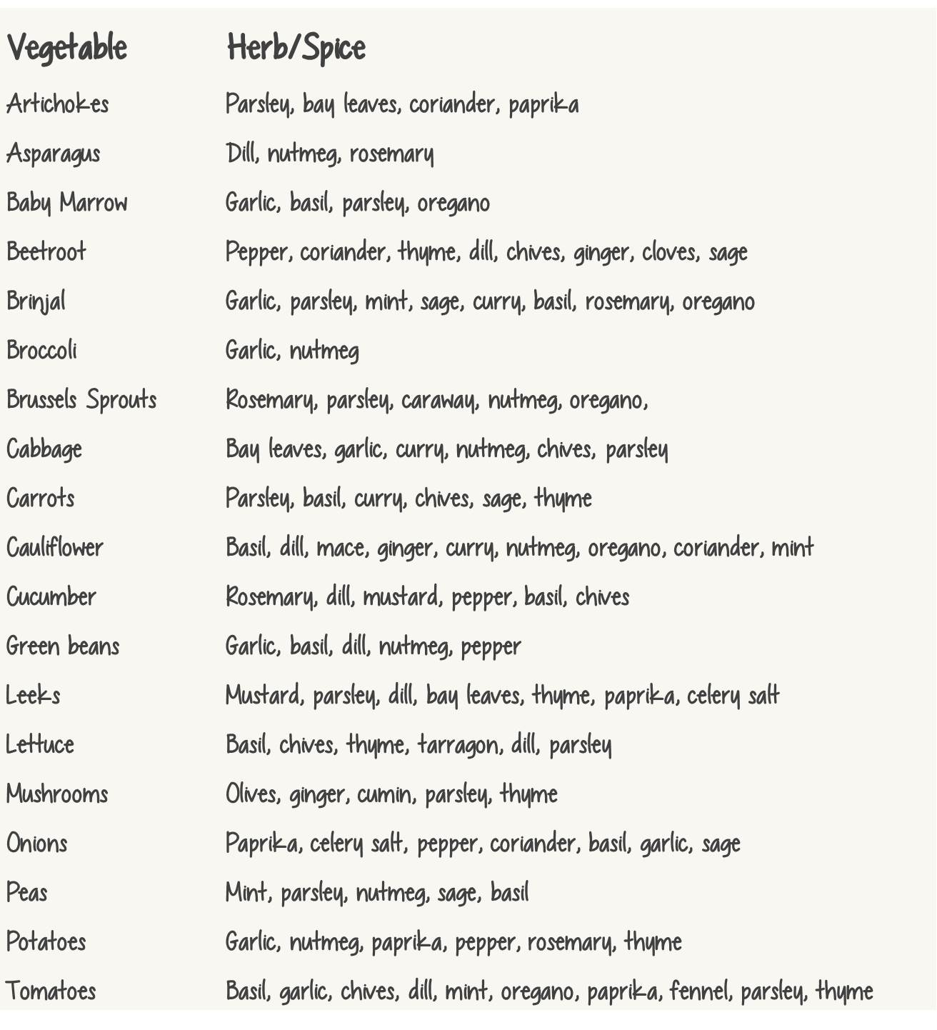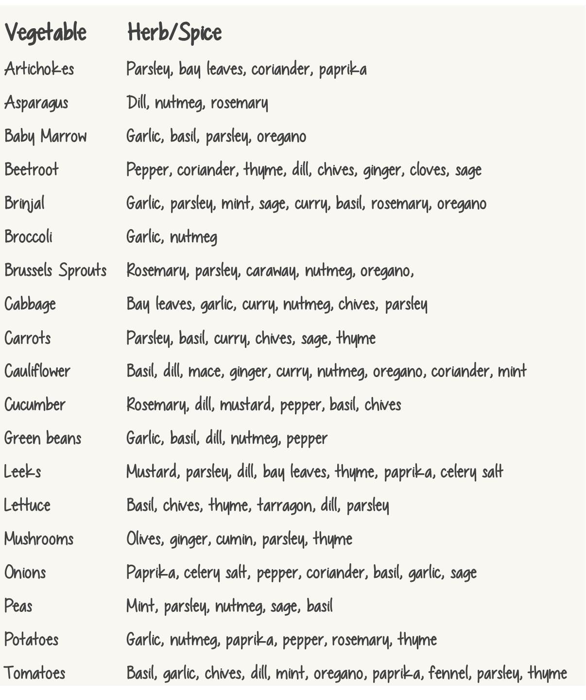 That said, healthy food need not be bland. Make use of herbs and spices to add flavour to your favourite go to dishes. The table below will help you to pair flavour filled spices with your favourite ingredients. Simply adding herbs to roasting veg rather than salt brings out the vegetables natural flavours, making them more enjoyable. Herbs and spices also have welcome nutritional properties. Low salt cooking is not only good for you but it can take your cooking to a whole new level. Get creative with flavours and spare the salt!